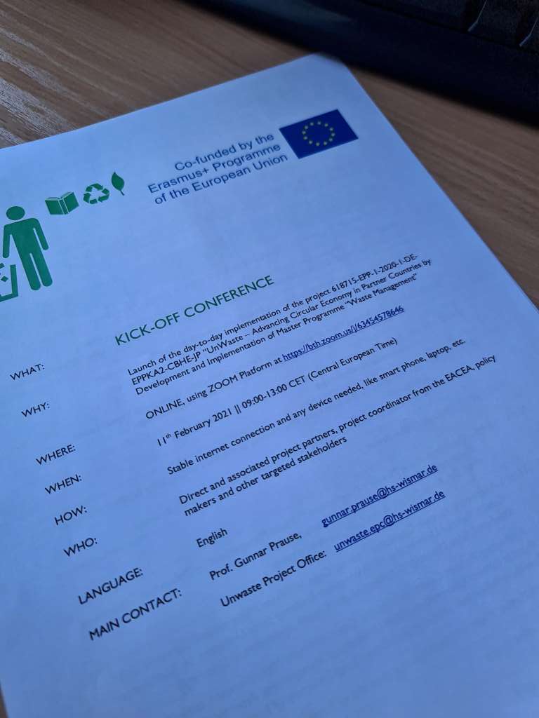 UnWaste project (Advancing circular economy in partner countries by development and implementation of Master programme "Waste management") partners met on February 11, 2021 online to participate in the project kick-off meeting, organized by the project coordinator.
