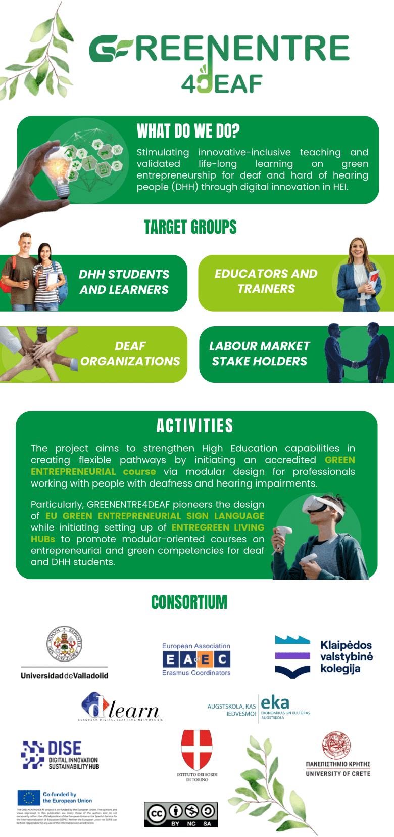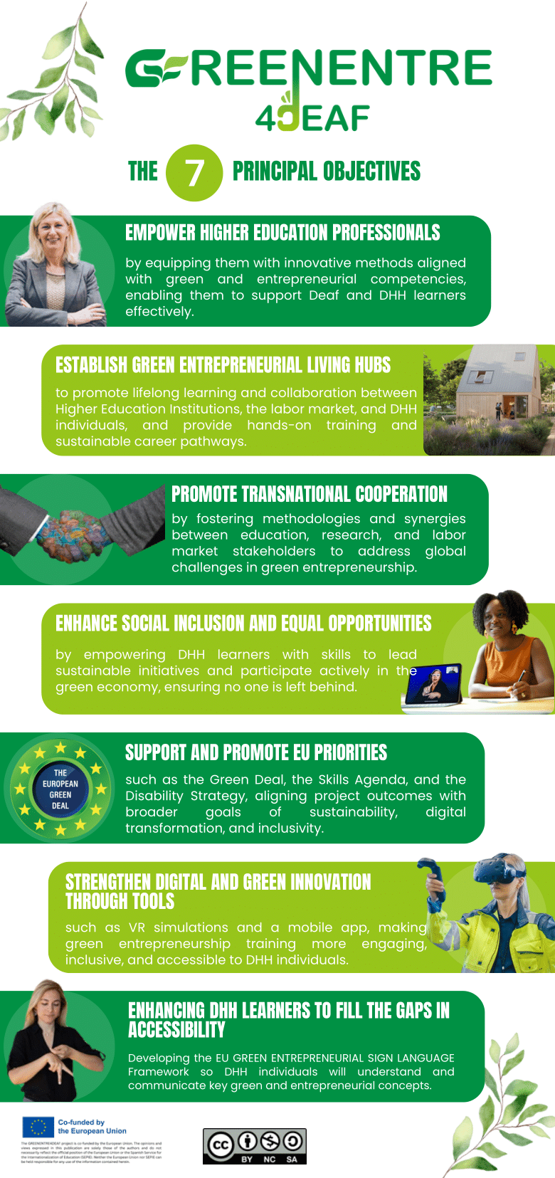 The main goals of GREENENTRE4DEAF are visible in the attached infographic, and the link to the project newsletter, where you can learn about the activities done in more detail, is HERE.