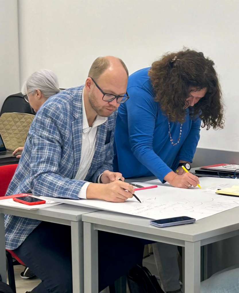 Pēdējā tikšanās dienā projektu rezultātu un nākamo soļu apspriešanā Ekonomikas un kultūras augstskolu pārstāvēja Edgars Čerkovskis un EKA Zinātniskās institūcijas projektu vadītājs Dr.oec. Kaspars Šteinbergs.