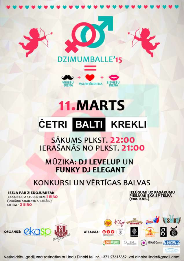 To celebrate St.Valentine’s Day, Women’s Day and Men’s Day on Wednesday, March 11th, the Student Council of the University College of Economics and Culture (UCEC SC) in cooperation with the Student Council of Latvian Academy of Sport Education (LASE SC) organize event “Dzimumballe” in music club “Četri balti krekli”. The party allows to celebrate all the holidays mentioned, enjoy romantic atmosphere, and possibly to find your soul mate.