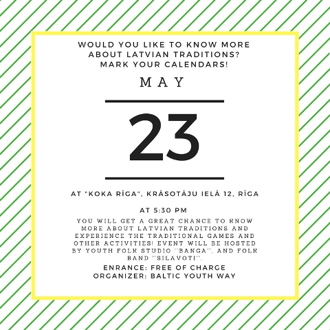 You will get a great chance to know more about Latvian traditions and experience the traditional games and other activities! Event will be hosted by youth folk studio ′′Banga′′, and folk band ′′Silavoti′′.