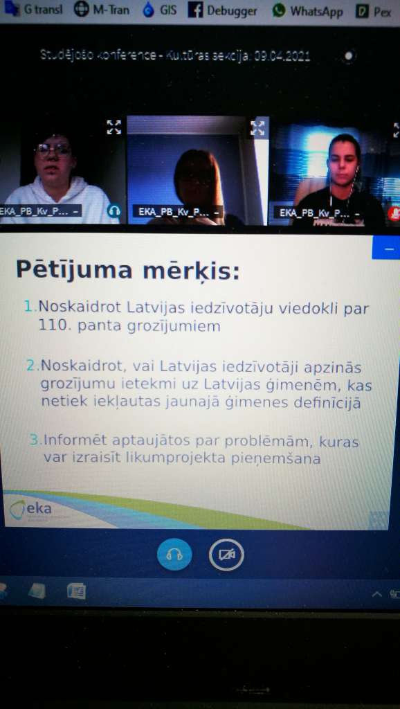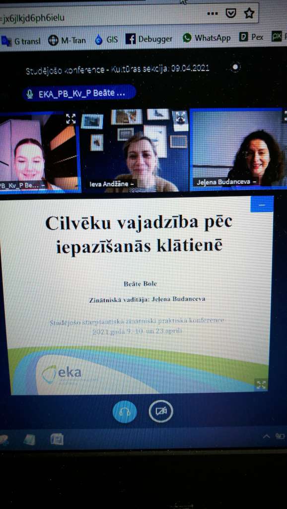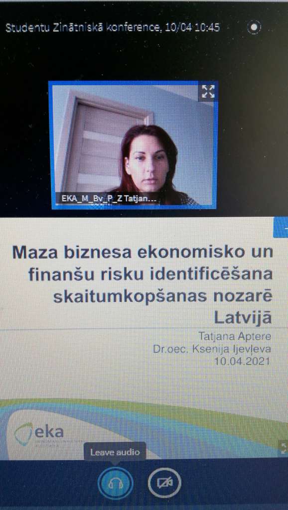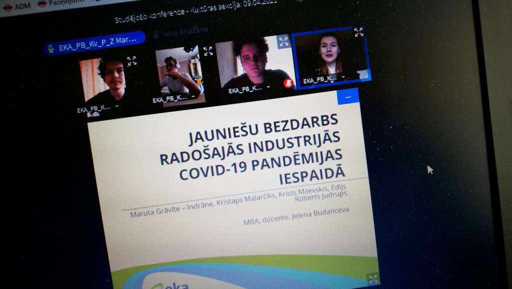 • Anete Karlīna Pole, Ieva Marija Galzone, Una Daniela Aizgale. EKA. COVID-19 PANDĒMIJAS IETEKME UZ KLĀTIENES STUDIJU FORMĀTA STUDENTIEM (zin. vadītāja Jeļena Budanceva)
