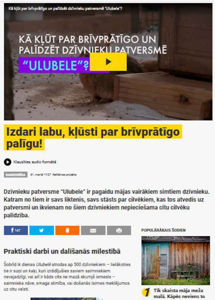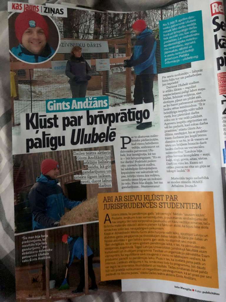 Zane Leine studē Pasākumu organizēšanu (iepriekš Izklaides industrijas vadību) un docētājas Ances Gricmanes uzraudzībā īsteno labdarības projektu, kas saistīts ar dzīvnieku patversmi “Ulubele”. Rezultātā izveidots profesionāls video par brīvprātīgo darbu, apjomīgas publikācijas portālā jauns.lv un žurnālā "Kas jauns", kā arī kopā ar brīvprātīgajiem veikti labiekārtošanas darbi patversmē.
