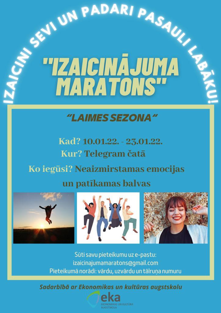 Smaidi tu pats, un arī pasaule pasmaidīs! "Izaicinājuma maratons" tiek rīkots balstoties uz Ekonomikas un kultūras augstskolas rīkoto "Laimes sezonu". Pildot uzdevumus, saņemsi punktus, par kuriem beigās būs iespējams saņemt patīkamas un arī lietderīgas balvas pasākuma tematikā.