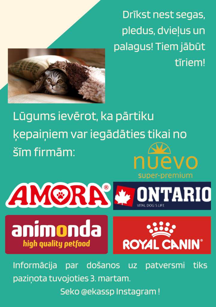 - Pārtika (no šīm firmām: Royal Canina, Animonda Carny, Amora, Nuevo, Ontario)