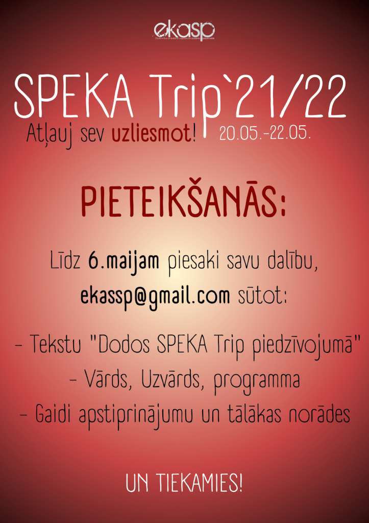 Vai esi gatavs savam studentijas lielākajam piedzīvojumam? Tieši tā - SPEKA Trip’21/22 ir klāt un tas notiks 20.-22. maijā!