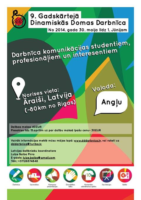 Tas ir pasākums, kas paredzēts sabiedrisko attiecību praktikantiem, profesionāļiem, studentiem un interesentiem! Dinamiskās Domas Darbnīcā ir iespēja radoši izpausties, iegūt jaunus kontaktus, kā arī spilgtas emocijas. Tur varēsi papildināt ne tikai teorētiskās zināšanas, bet arī iegūt praktiskās iemaņas, veidojot reālas sabiedrisko attiecību kampaņas uzņēmumiem, piedaloties "Lifta stāstu" sacensībās, kā arī diskutējot - un tas viss svaigā gaisā.