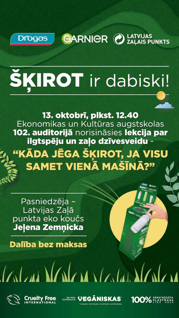 13. oktobrī plkst. 12.40 EKA, 102. auditorijā norisināsies lekcija par ilgtspēju un zaļo dzīvesveidu "Kāda jēga šķirot, ja visu samet vienā mašīnā?".