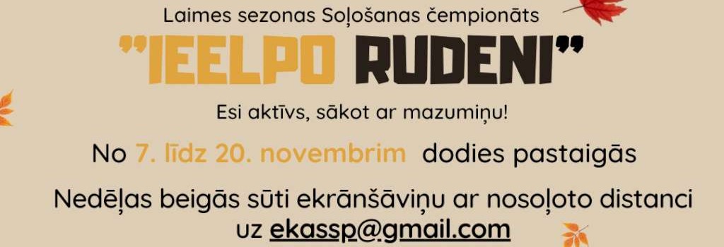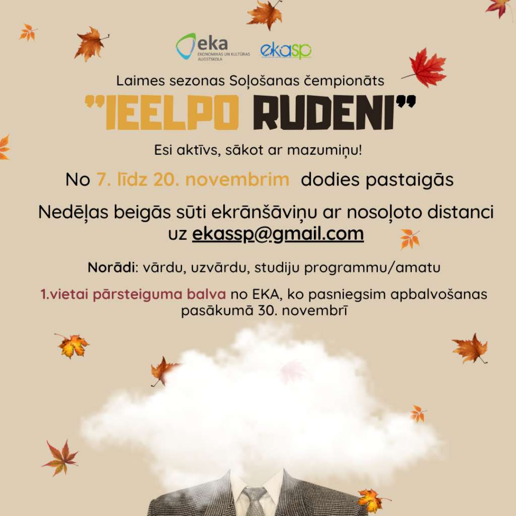 Arī šogad Ekonomikas un kultūras augstskolas ,,Laimes sezonas’’ projekta ietvaros ikviens ir aicināts piedalīties soļošanas čempionātā “Ieelpo rudeni”. Čempionāta mērķis ir uzlabot gan fizisko, gan mentālo veselību, aicinot saspringtajā ikdienas skrējienā atrast laiku izkustēties, ieelpot rudenīgo gaisu un atklāt arvien jaunas pastaigu vietas.Lai piedalītos soļošanas čempionātā, katram dalībniekam dienas vai nedēļas beigās jāatsūta ekrānuzņēmums ar saviem nosoļotajiem kilometriem vai soļiem uz ekasp@gmail.com, norādot savu vārdu, uzvārdu, studiju programmu vai amatu. Aktīvie soļotāji tiek aicināti arī ievietot bildes no savām pastaigām sociālajos medijos, izmantojot tēmturus #ieelporudeni un #breathatheautumn.