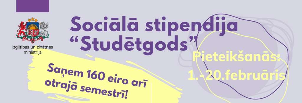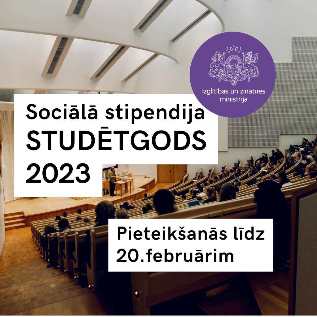 Līdz 20. februārim studējošie no daudzbērnu ģimenēm, bāreņi un bez vecāku apgādības palikušie jaunieši, kā arī studējošie ar I. un II. grupas invaliditāti var pieteikties sociālajai stipendijai “Studētgods”, kas noteikta 160 eiro mēnesī. Pieteikumu var iesniegt elektroniski, izmantojot valsts pārvaldes pakalpojumu portālu latvija.lv.