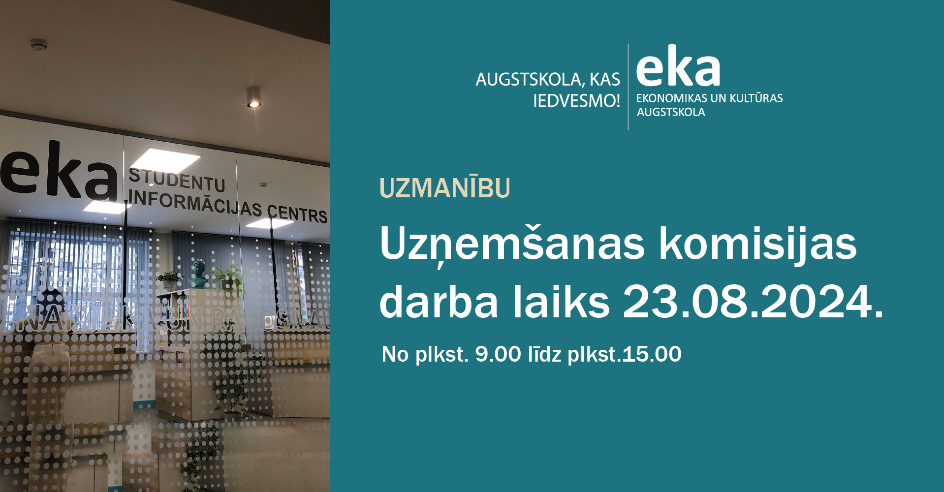 Uzņemšanas komisijas un Studentu Informācijas centra (SIC) darba laiks 23.08.2024.: no plkst. 9.00 līdz plkst.15.00.