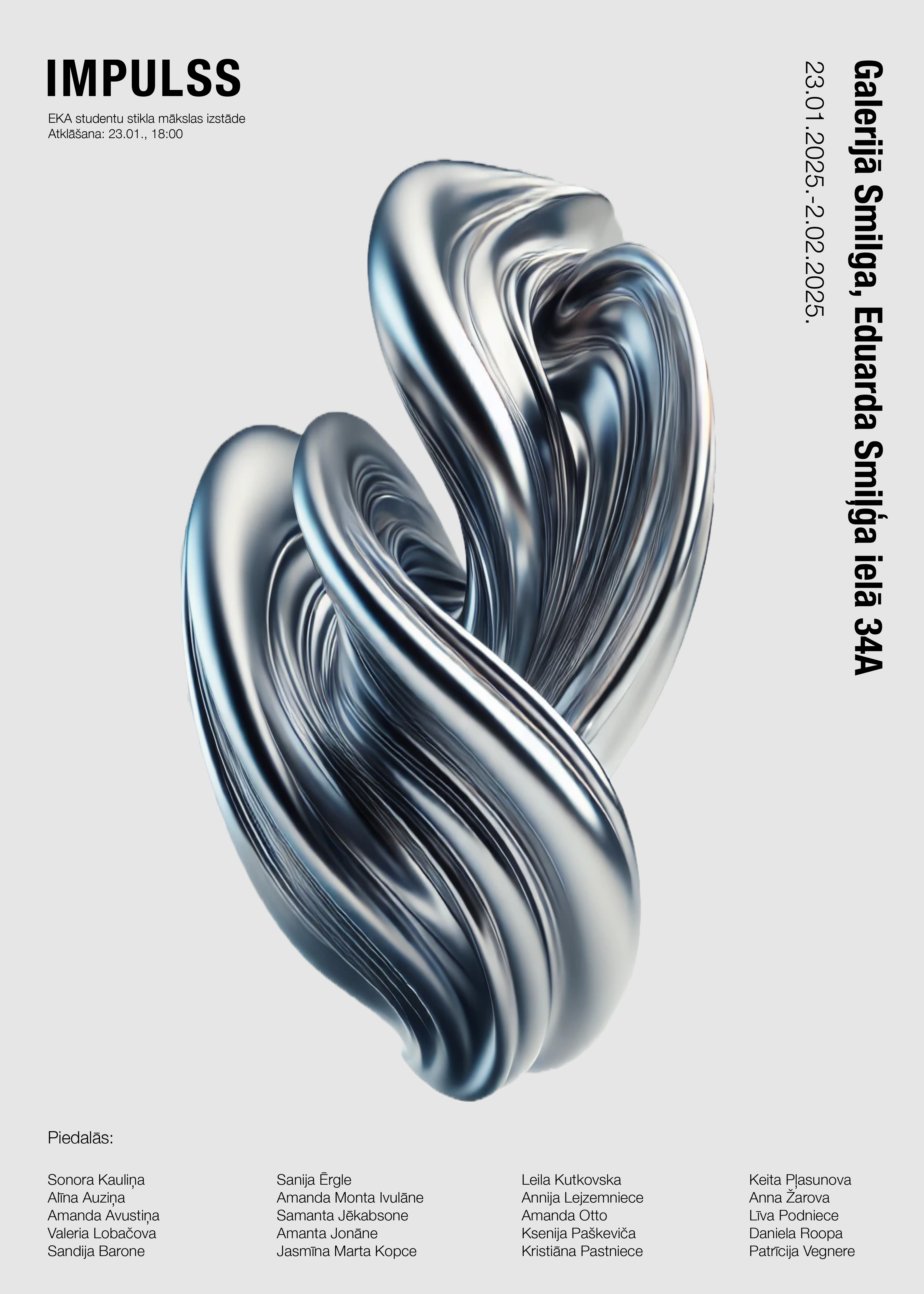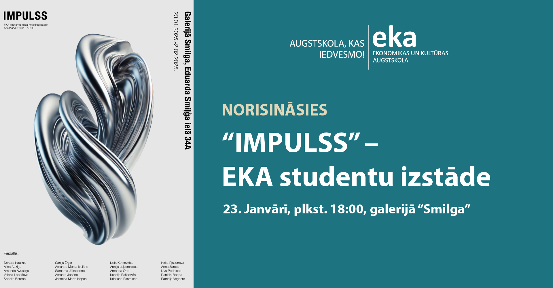23. janvārī, plkst. 18:00, aicinām ikvienu interesentu uz Ekonomikas un Kultūras augstskolas interjera dizaina studentu darbu izstādi. Eksponātus ir veidojuši jaunie dizaineri, iepazīstot stiklu studiju procesā.