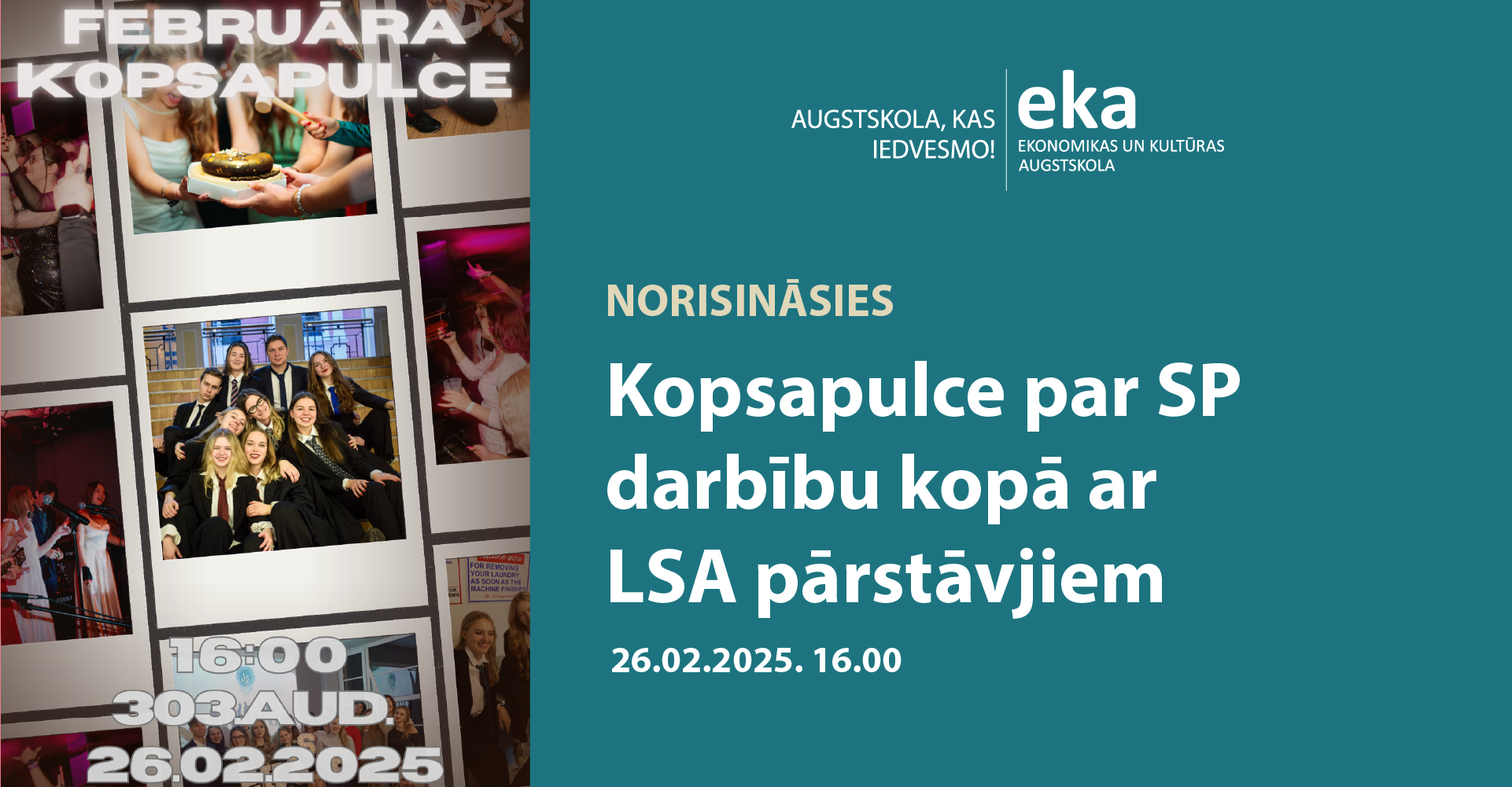 EKA SP aicina uz februāra kopsapulci, kurā tiks pārrunāta studentu pašpārvaldes darbība, aizvadītie notikumi un turpmākie plāni. Šajā tikšanās reizē pievienosies arī Latvijas Studentu apvienības (LSA) pārstāvji, lai kopīgi izvērtētu aktuālos jautājumus un diskutētu par pašpārvaldes darbības pilnveidi.