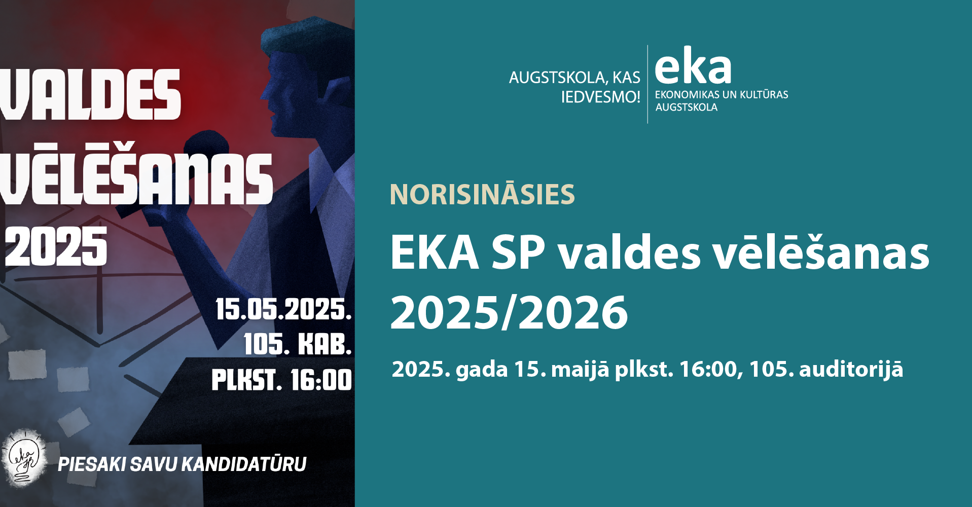 Ir pienācis laiks veidot jauno EKA Studentu pašpārvaldes valdi! Ja jūti sevī vēlmi darboties, ietekmēt studentu ikdienu un augt kopā ar EKA SP – šī ir Tava iespēja. Tās notiks 2025. gada 15. maijā plkst. 16:00, 105. auditorijā (Tiesu zālē).