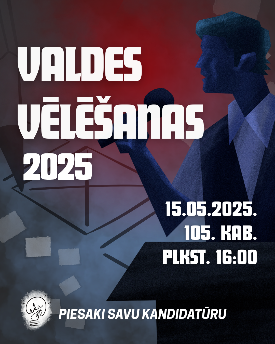Vēlēšanas norisināsies: 15. maijā plkst. 16:00 Tiesu zālē (105. auditorijā)