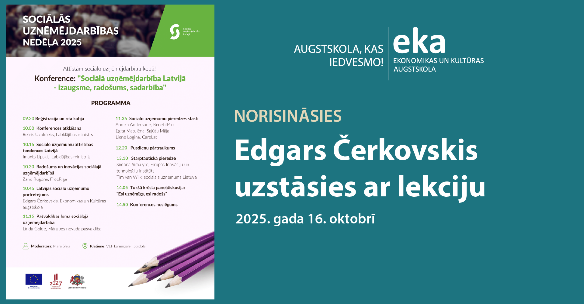 16. oktobrī plkst. 10.45 Edgars Čerkovskis, EKA maģistra studiju programmas “Aprites ekonomika un sociālā uzņēmējdarbība” direktors, uzstāsies ar lekciju “Latvijas sociālo uzņēmumu portretējums” Labklājības ministrijas rīkotajā sociālās uzņēmējdarbības konferencē “Sociālā uzņēmējdarbība Latvijā – izaugsme, radošums, sadarbība” VEF kvartāla Spīdolas zālē, Ieriķu ielā 5A, Rīgā.