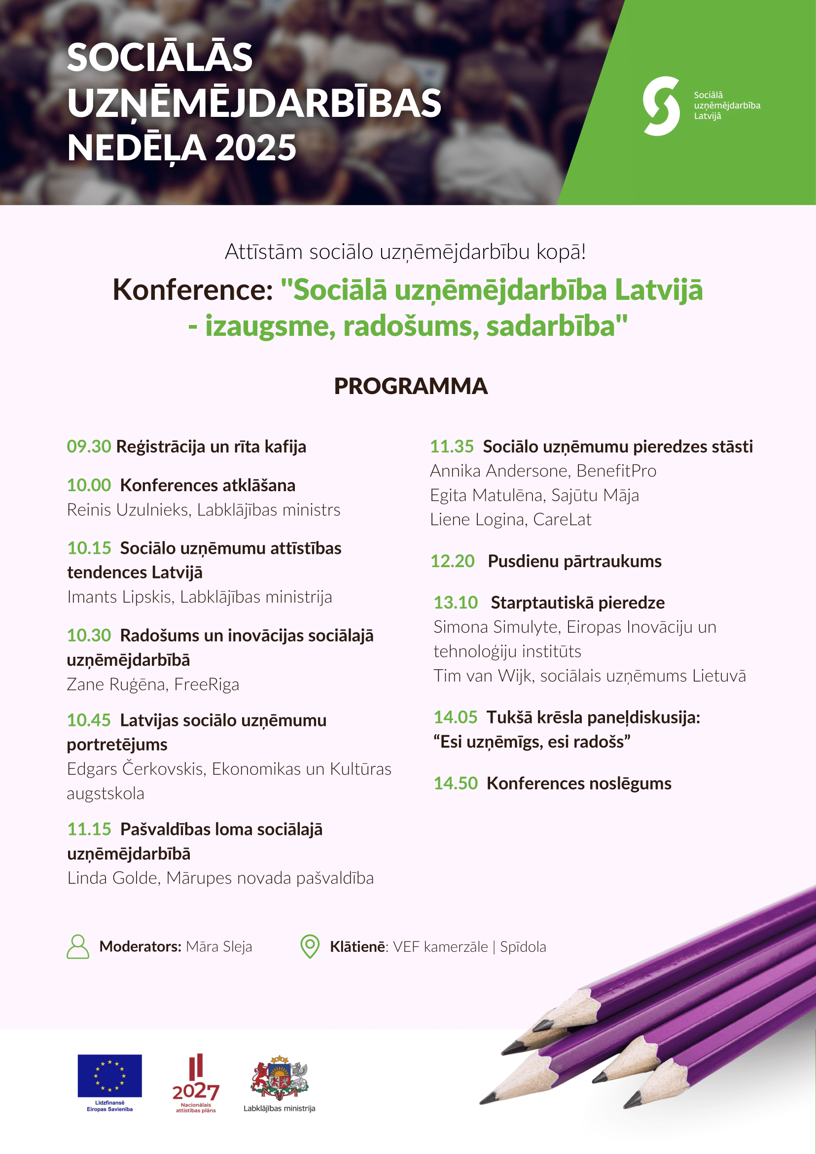 Konference ir daļa no Sociālās uzņēmējdarbības nedēļas, un tā pulcēs plašu dalībnieku loku — sociālos uzņēmējus, valsts un pašvaldību pārstāvjus, ekspertus, pētniekus un starptautiskos viesus. Tās mērķis ir veicināt diskusijas par izaugsmi, radošumu un sadarbību sociālās uzņēmējdarbības attīstībā Latvijā.