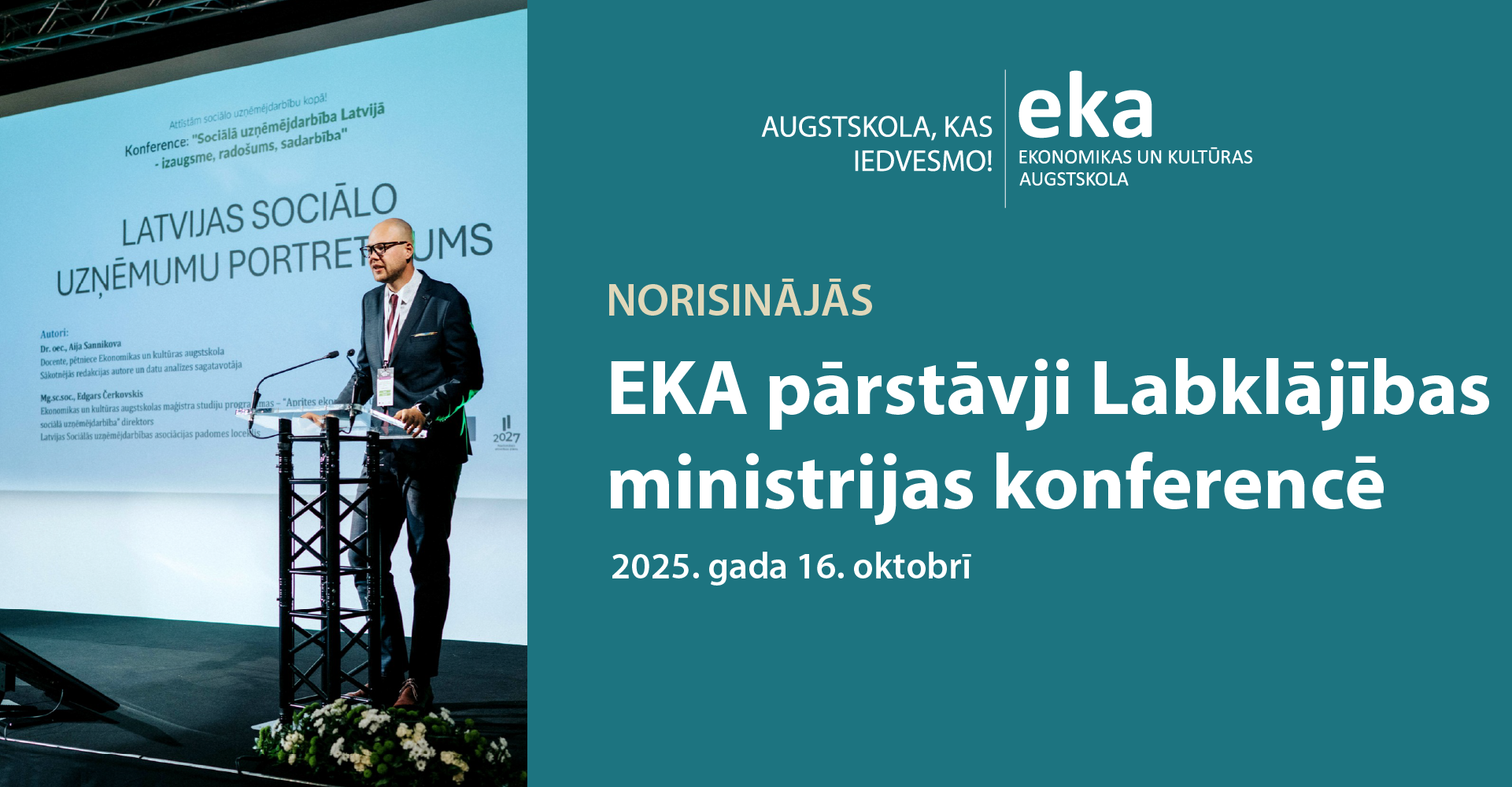 Ekonomikas un kultūras augstskolas (EKA) pārstāvji Aija Sannikova, docente un pētniece, un Edgars Čerkovskis, lektors un maģistra studiju programmas "Aprites ekonomika un sociālā uzņēmējdarbība" direktors piedalījās Labklājības ministrijas organizētajā konferencē, kuras ietvaros prezentēja jaunāko Latvijas sociālās uzņēmējdarbības nozares analītisko pārskatu 2025.