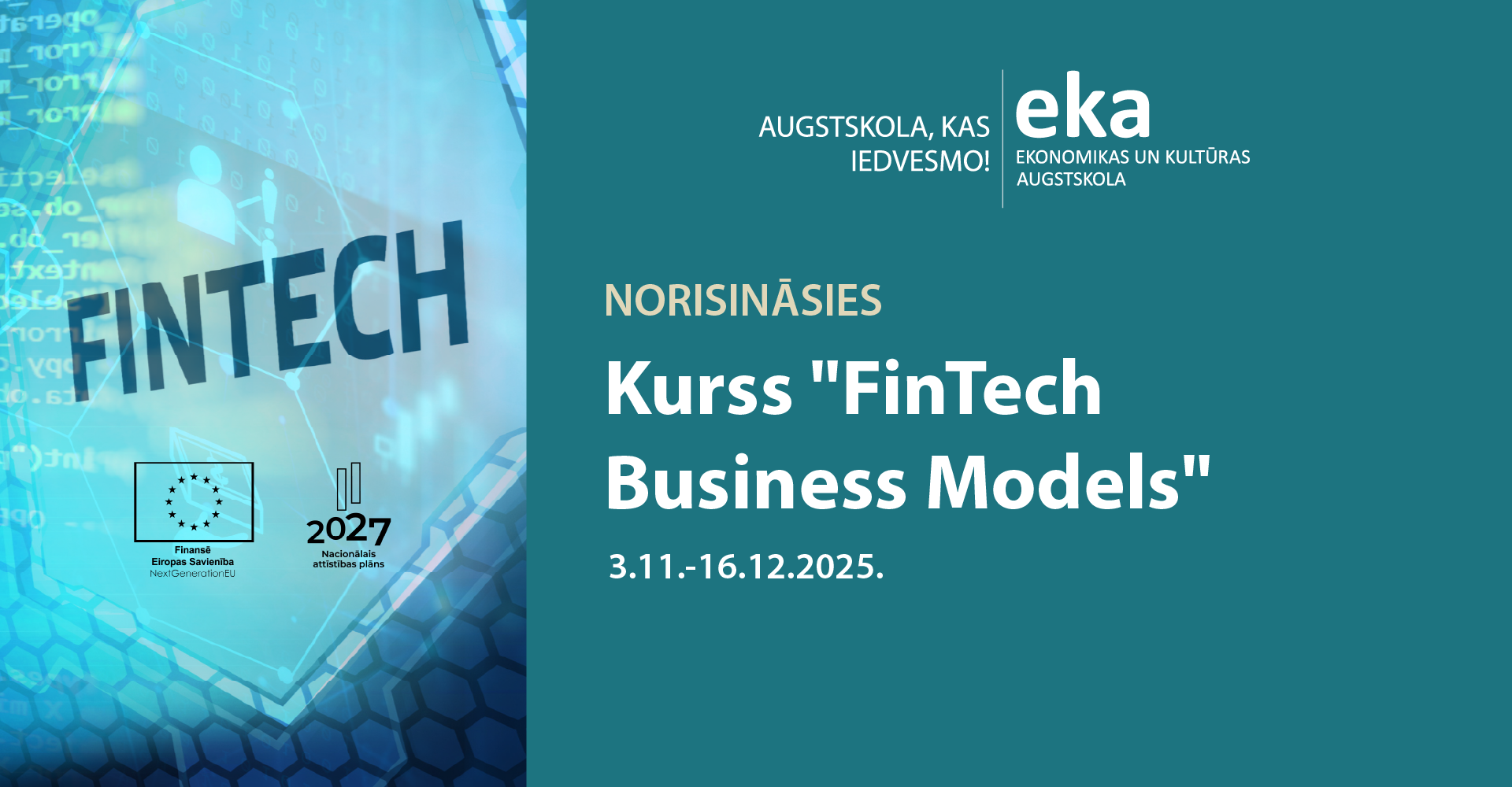 Finanšu tehnoloģiju (FinTech) joma šobrīd piedzīvo spēcīgu attīstības vilni visā pasaulē. Latvijā tai ir ievērojams potenciāls – pateicoties nozares eksportspējai un dinamiskajam tirgum, mūsu valstij ir ambīcijas kļūt par reģionālo līderi. Kursu laikā studenti iegūs zināšanas un prasmes, kas palīdzēs izprast nozares aktuālās tendences, izstrādāt inovatīvus risinājumus un veidot ilgtspējīgus biznesa modeļus.