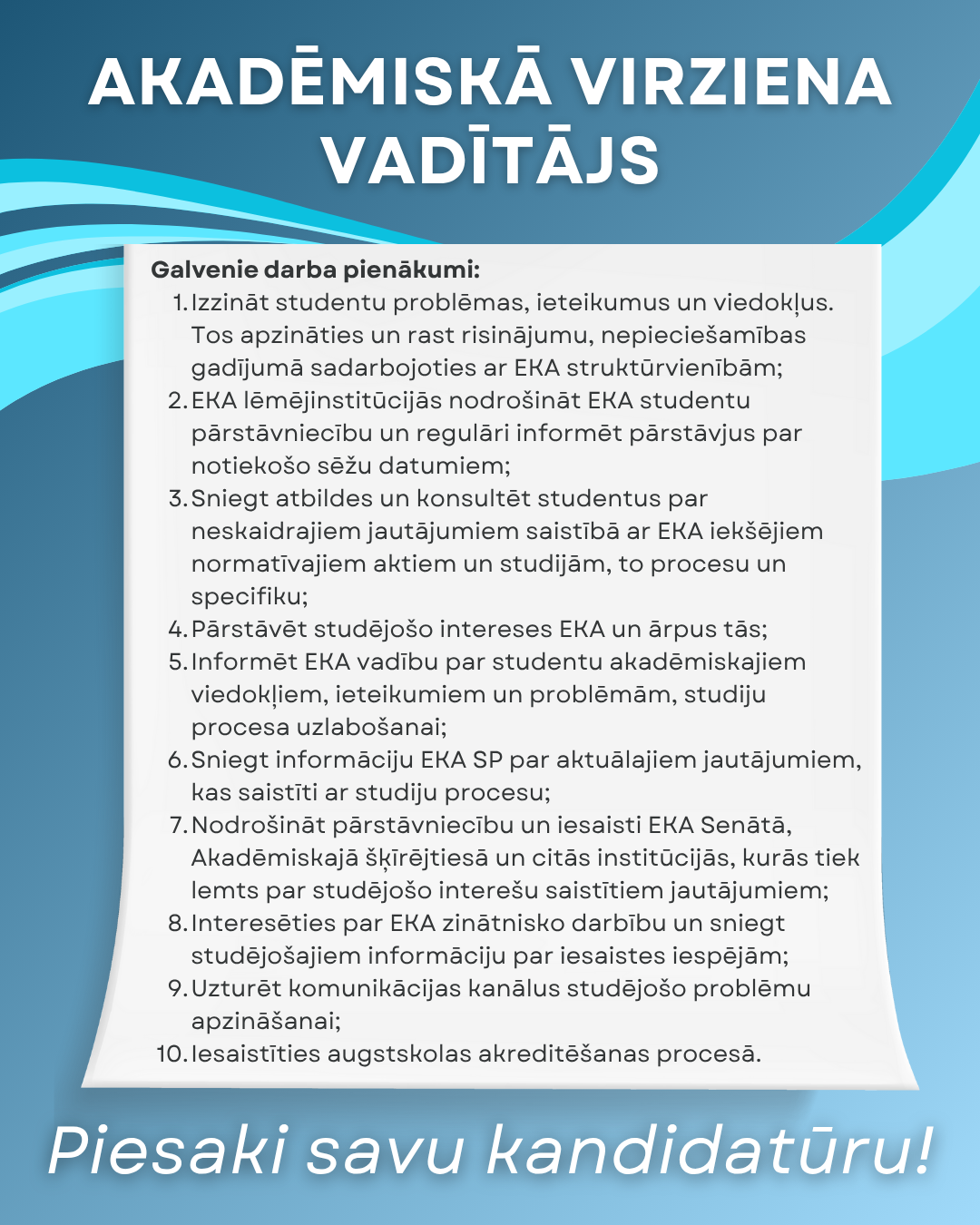 Kandidātu pieteikumus sūtīt uz ekassp@gmail.com līdz 30. novembrim plkst. 23:59. Jautājumu gadījumā sazināties ar EKA SP priekšsēdētāju Darju Golubevu: +371 20403991 vai darjagolubeva0@gmail.com