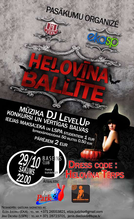 Jau otro gadu Ekonomikas un Kultūras augstskolas Studentu pašpārvalde (EKA SP) sadarbībā ar Latvijas Sporta pedagoģijas akadēmijas Studentu pašpārvaldu (LSPA SP) rīko Helovīnu pasākumu, uz kuru jāierodas Visu svēto dienas kostīmos. Šogad ballīte notiks 29. oktobrī klubā “Baseins”. Ieeja no plkst. 22:00.