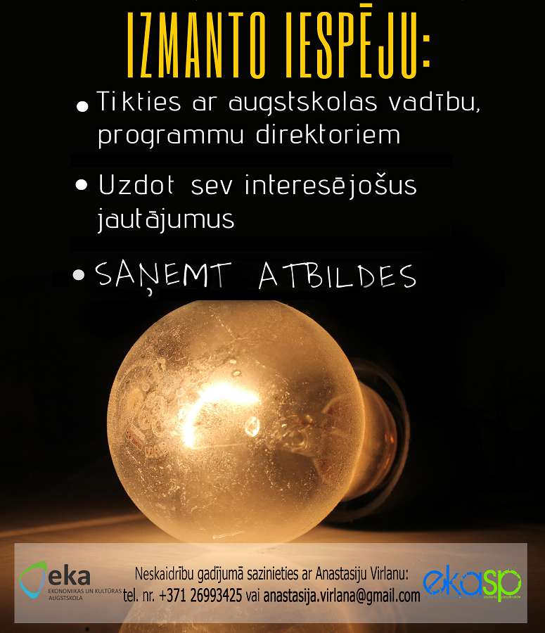 Tev ir neskaidrības par studiju maksu, varbūt vēlies zināt vairāk par kopmītņu sadarbību ar augstskolu, vai Tevi interesē budžeta vietu sadalījums un ar to saistītās aktivitātes, vai Tev ir jautājumi par izglītības kvalitāti? Vai varbūt ir jautājums, kuru baidies uzdot? Nebaidies, jo Tev ir tiesības zināt un uzzināt! Tāpēc izmanto iespēju rast atbildi uz sev svarīgiem jautājumiem 25. novembrī plkst. 16.00 Ekonomikas un Kultūras augstskolas (EKA) 305. auditorijā, kur norisināsies „Tikšanās ar vadību”. Tev būs iespēja tikties ar augstskolas vadību, programmu direktoriem un citiem darbiniekiem, lai uzdotu sev interesējošus jautājumus un saņemtu atbildes. Mums esi svarīgs Tu, student, un Tavs viedoklis.