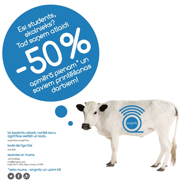 Reklāmas aģentūra “Airginity” līdz 31.01.2015. piedāvā studentiem 50% atlaidi drukas pakalpojumiem