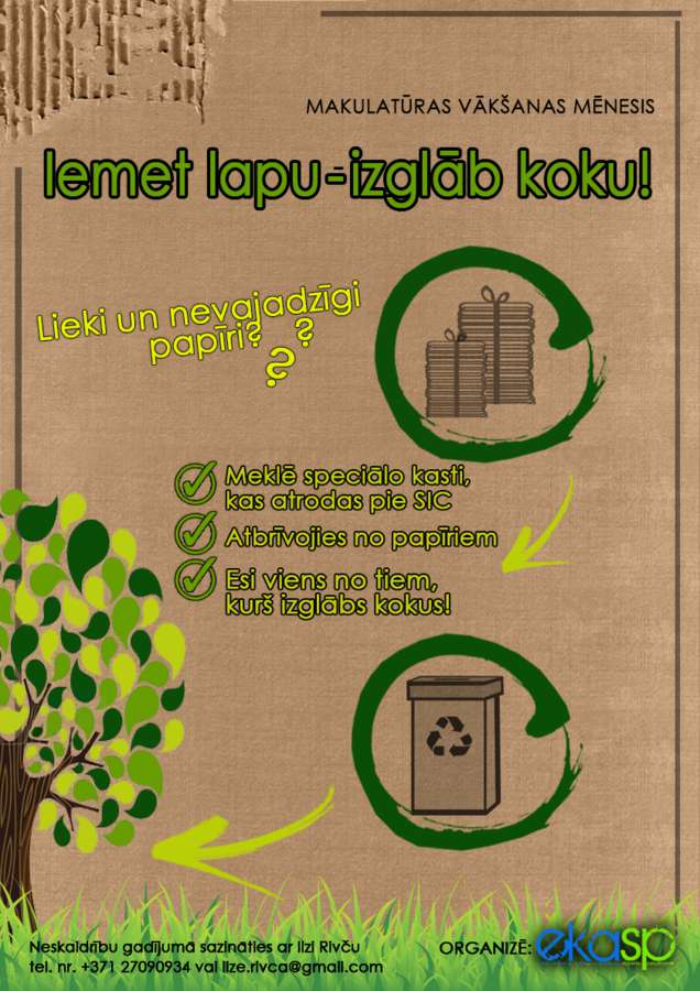 Papīrus un kartonus būs iespējams mest speciālā kastē pie Studiju informācijas centra (SIC), tādējādi kļūstot par vienu no tiem, kurš izglābs koku! Akcijai beidzoties, kopīgi savāktā makulatūra nonāks papīrfabrikā „Līgatne’’, lai uzsāktu savu otrreizējo dzīvi.