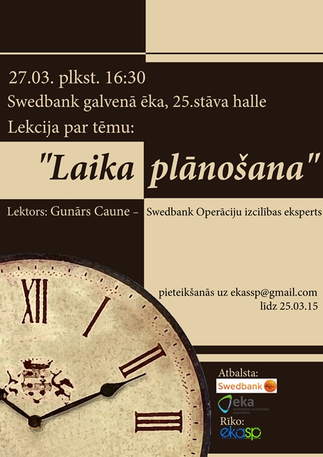 Pirmā lekcija notiks jau šo piektdien, 27. martā plkst. 16:30, kurā Swedbank Operāciju izcilības eksperts Gunārs Caune stāstīs par laika plānošanu. Lekcija norisināsies Swedbank galvenajā ēkā 25. stāva hallē.