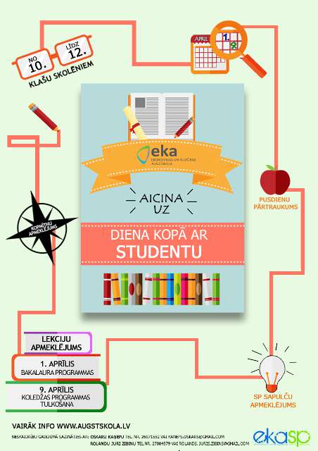 EKA studenti aicina piedalīties notikumā „Diena kopā ar studentu”! 1. aprīlī visi vidusskolēni un koledžas programmu studenti, kuri vēlas studēt bakalaura studiju programmas, kā arī 9. aprīlī tie, kuri vēlas studēt tulkošanu un koledžas programmas, tiek mīļi gaidīti EKA telpās, lai kopīgi gūtu priekštatu par to, kā tas ir - būt EKA studentam?