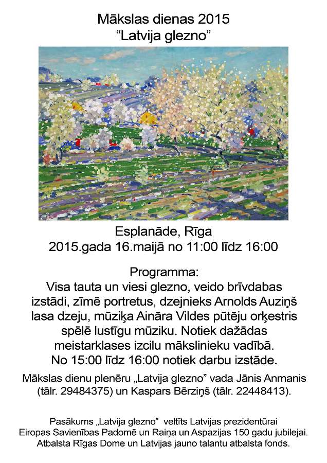 Par godu Latvijas prezidentūrai Eiropas Savienības Padomē un Raiņa un Aspazijas 150 gadu jubilejai tiek rīkots pasākums "Latvija glezno", kas norisināsies Esplanāde 16.maijā no plkst. 11:00 līdz 16:00.