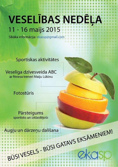 No 11. līdz pat 16. maijam katrs Ekonomikas un kultūras augstskolas students ir aicināts piedalīties Veselības nedēļas aktivitātēs, lai labi un veselīgi pavadītu laiku. Būs iespēja gardi panašķēties, aktīvi pasportot un smelties zināšanas par dzīvesveida uzlabošanu no speciālista.