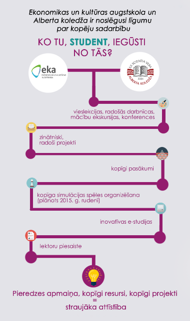 Kā zināms, katra sadarbība ir solis pretī attīstībai, tādēļ Ekonomikas un kultūras augstskola ir noslēgusi sadarbības līgumu ar Alberta koledžu, kas nodrošina gan pieredzes apmaiņu, gan kopīgus resursus un projektus. Iepazīsties ar to, ko Tu, student, iegūsti no šīs sadarbības!