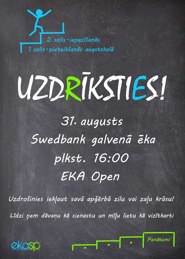 Ja esi pieteicies studijām Ekonomikas un kultūras augstskolā, tad zini, ka 31. augustā Tev jābūt Swedbank Latvia galvenajā ēkā plkst. 16:00, lai sāktu savu radošo, aizraujošo un panākumiem pilno studiju laiku!