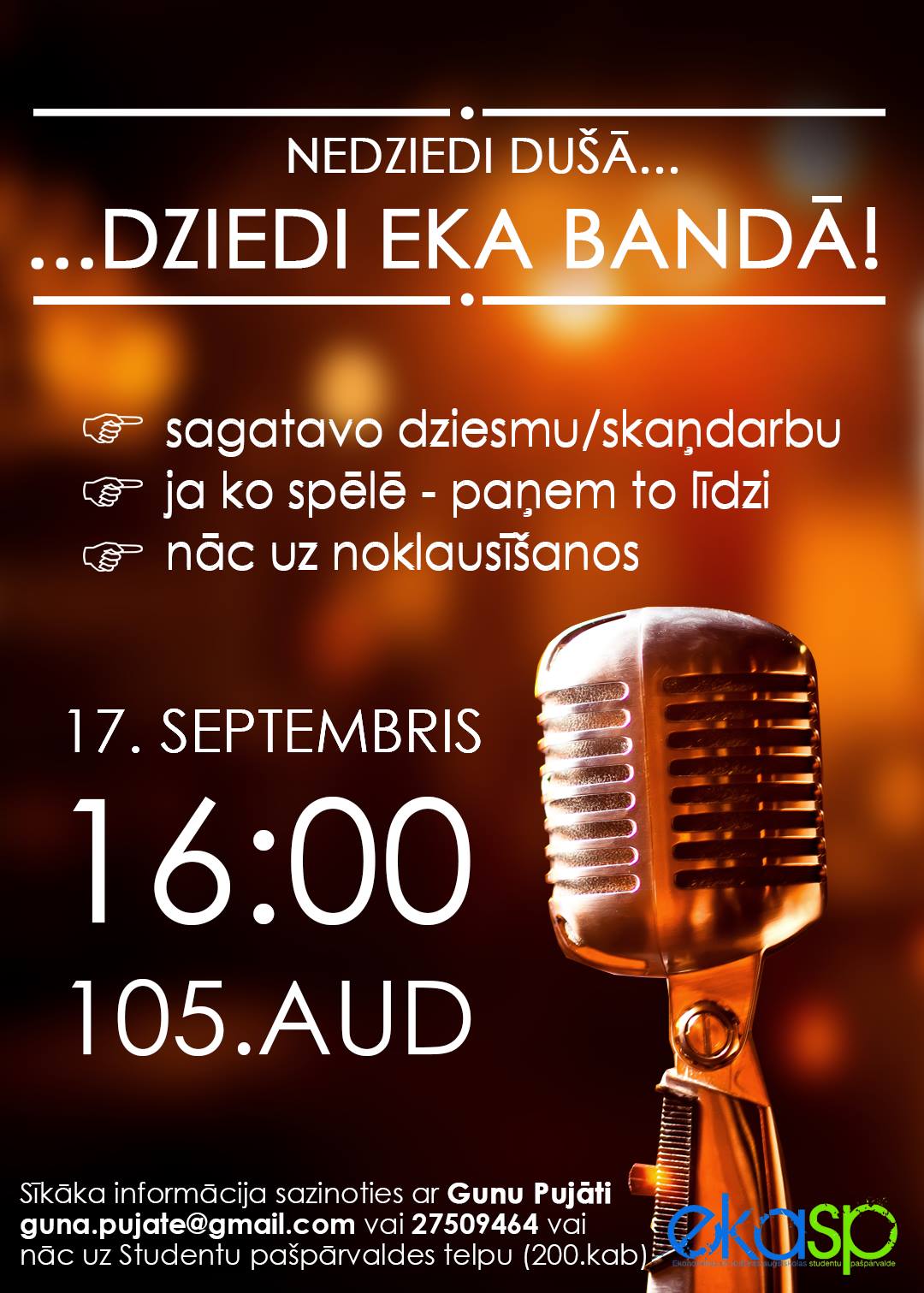 Ir pagājis gads un augstskolas radoši muzikālā grupa „EKA BANDA” ir pierādījusi sevi daudzās akcijās un pasākumos, un šobrīd ir laiks atkal virzīties pretī izaugsmei, ..