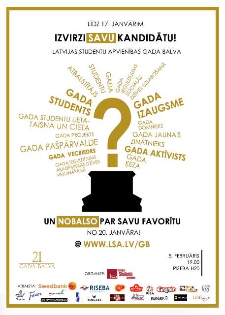 Vairāk par nominācijām, pretendentu pieteikšanas un vērtēšanas kārtību var uzzināt LSA Gada balvas nolikumā. Pirms kandidātu izvirzīšanas projekta organizatori aicina rūpīgi iepazīties ar pasākuma nolikumu. Svinīgā balvu pasniegšanas ceremonija notiks 5. februārī augstskolas RISEBA telpās (Durbes iela 4).
