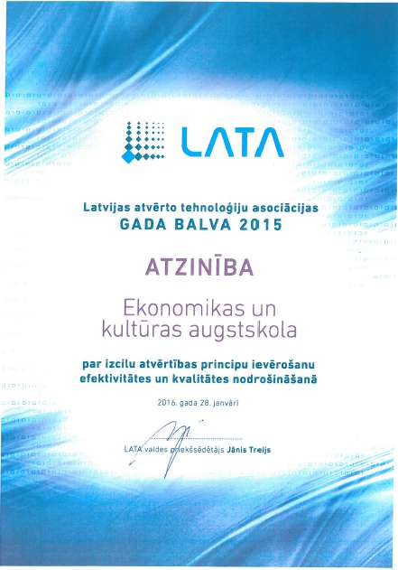 EKA bija izvirzīta LATA balvai kategorijā Atvērtākā iestāde. LATA atzinīgi novērtējusi EKA par atvērtu tehnoloģiju izmantošanu studiju programmas Informācijas tehnoloģijas izveidē un īstenošanā, kā arī par atvērto tehnoloģiju olimpiādes Open Mind organizēšanu skolēniem. Par to īpašs paldies EKA un Alberta koledžas pasniedzējam Andrim Gabrānovam!