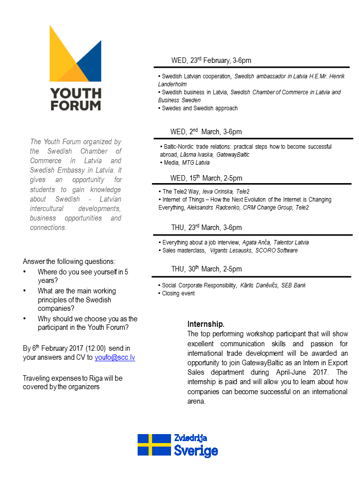 Latvijā studējošiem jauniešiem tiek dota lieliska iespēja piedalīties Zviedrijas vēstniecības Latvijā un Zviedrijas Tirdzniecības kameras Latvijā organizētajā projektā “Youth Forum 2017”. Projekts norisināsies angļu valodā un piecos semināros studentiem tiks dota iespēja bagātināt savas zināšanas par Zviedrijas-Latvijas sadarbību, biznesa kultūru un attīstību, iemācīties pamat mārketinga prasmes un darba intervijas pamatprincipus, uzzināt vairāk par korporatīvo sociālo atbildību, kā arī apmeklēt vairākus Latvijā populārus uzņēmumus, kuri iepazīstinās ar savu darbību.