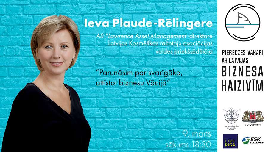 Aicinām uz tikšanos ar Ievu Plaudi - Rēlingeri! Vakara gaitā runāsim ne vien par ārējās tirdzniecības pirmsākumiem Latvijā, zīmola "Kolonna" attīstību un Latvijas kosmētikas ražotāju potenciālu, bet arī parunāsim par Vācijas biznesa īpatnībām un rīkiem, kuri palīdzētu Latvijas uzņēmējiem veiksmīgāk apgūt Vācijas tirgu.