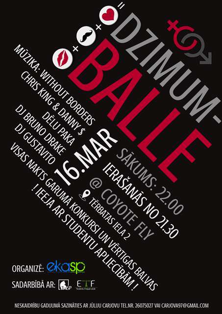 Šī gada īpašais datums ir 16. marts, ko visi kopā atzīmēsim klubā COYOTE FLY, Tērbatas ielā 2. Ieeja pasākumā no plkst. 22:00 šo augstskolu studentiem, uzrādot studentu apliecību, bet pēc pusnakts, pasākumu apmeklēt var ikviens interesents.