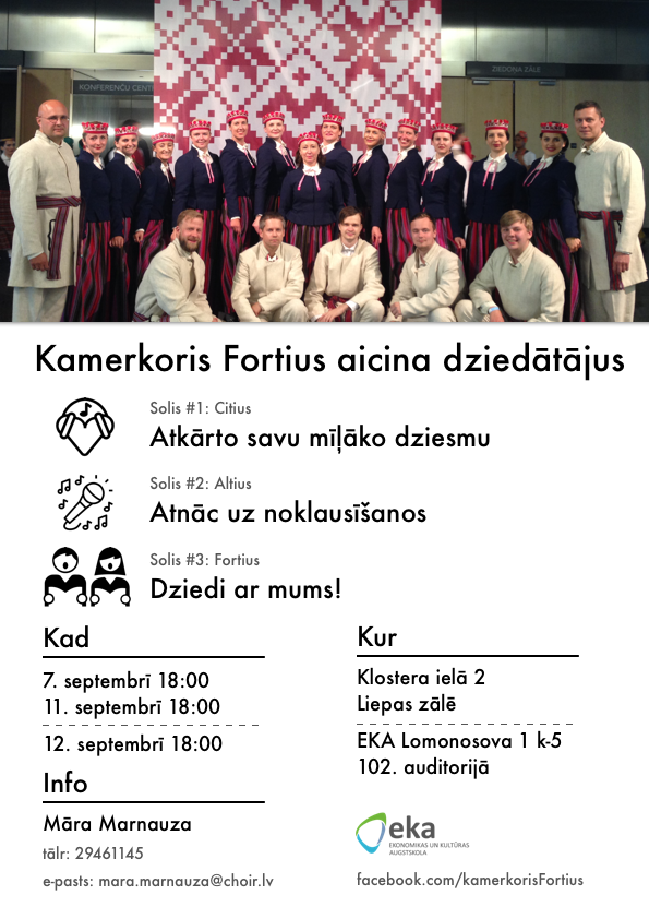 Kamerkoris FORTIUS un tā mākslinieciskā vadītāja diriģente Māra Marnauza, ar š.g. septembri turpinās savu radošo darbību Ekonomikas un kultūras augstskolā! Sezonu koris uzsāks ar jauno dziedātāju noklausīšanos un uzņemšanu 7. septembrī un 11. septembrī no plkst.18:00 Klostera ielā 2, Liepas zālē, kā arī 12. septembrī plkst.18:00 Ekonomikas un kultūras augstskolā, Lomonosova ielā 1 k-5, 102. auditorijā. Būsiet sirsnīgi gaidīti!