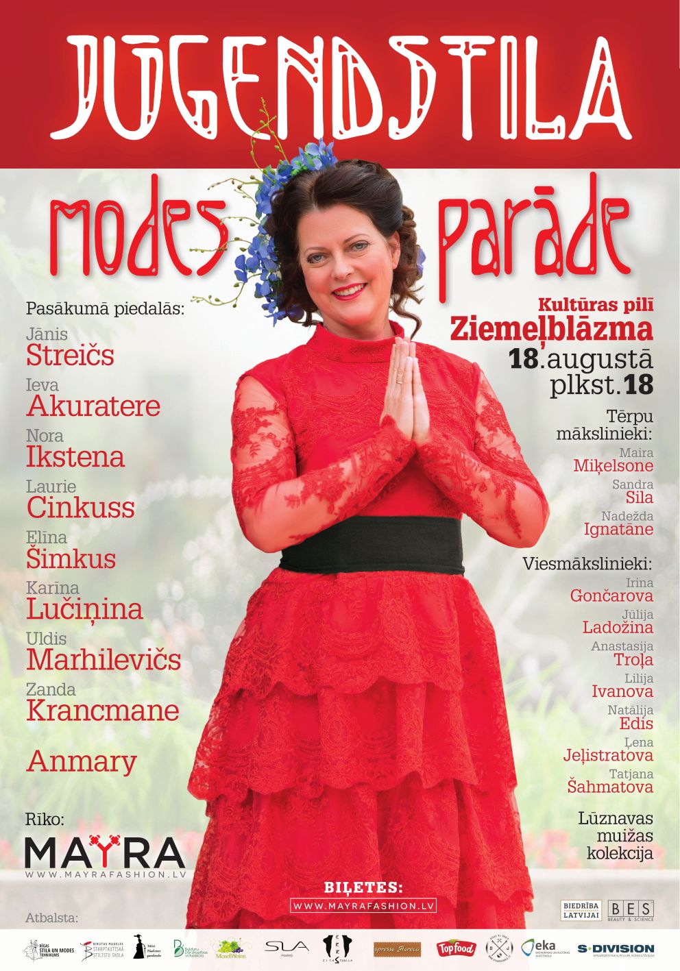 Jūgendstila tērpu modes parāde norisināsies pirmo reizi, un modeļu lomā iejutīsies tādas sabiedrībā pazīstamas dāmas, kā dziedātājas Ieva Akuratere, Lorija Cinkuss, Inga Šļubovska-Kancēviča, Elīna Šimkus, Linda Dinsberga (Anmary), aktrises Ērika Eglija, Karīna Lučiņina un Mirdza Martinsone, māksliniece Ilze Patmalniece, LTV Kultūras ziņu redakcijas žurnāliste Līga Gaigala, sportiste Jeļena Prokopčuka, žurnāla "Ļubļu" galvenā redaktore Inna Avina, žurnāliste Ilona Jahimovica un daudzas citas, kopumā vairāk nekā 100 modeles. Tērpus papildinās jūgendstilā ieturētas rotas un cepures, kā arī citi aksesuāri – somiņas, lietussargi u.tml.