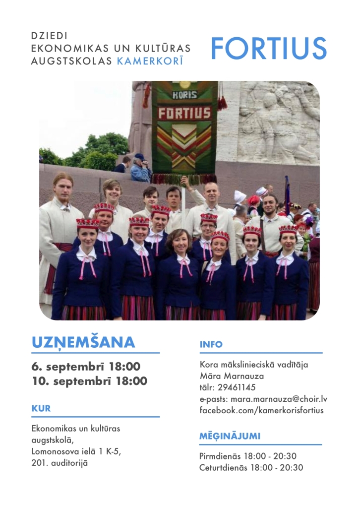 Tevi uzrunā jauni izaicinājumi, aizraujoši kormūzikas projekti, draudzīgs kolektīvs? Nāc uz jauno dalībnieku uzņemšanu 6. septembrī vai 10. septembrī plkst. 18.00 Ekonomikas un kultūras augstskolā un esi kopā ar mums kamerkorī FORTIUS!