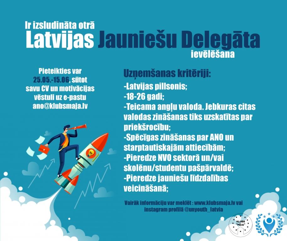 Jauniešu nevalstiskā organizācija “Klubs “Māja”- jaunatne vienotai Eiropai” (turpmāk tekstā Klubs “Māja”) izsludina konkursu jauniešiem, vecumā no 18 līdz 26 gadiem, lai atrastu nākamo Latvijas Apvienoto Nāciju Organizācijas Jauniešu delegātu. Konkurss norisināsies trīs kārtās - pirmā kārta, kurā jauniešiem ir jāiesniedz savs CV un motivācijas vēstule norisināsies no 25.maija līdz 15.jūnijam. Jaunieši tiek aicināti savus pieteikumus nosūtīt uz e-pasta adresi ano@klubsmaja.lv. Pretendenti, kuri būs sevi vislabāk parādījuši tiks aicināti uz interviju un zināšanu pārbaudi jeb otro konkursa kārtu.