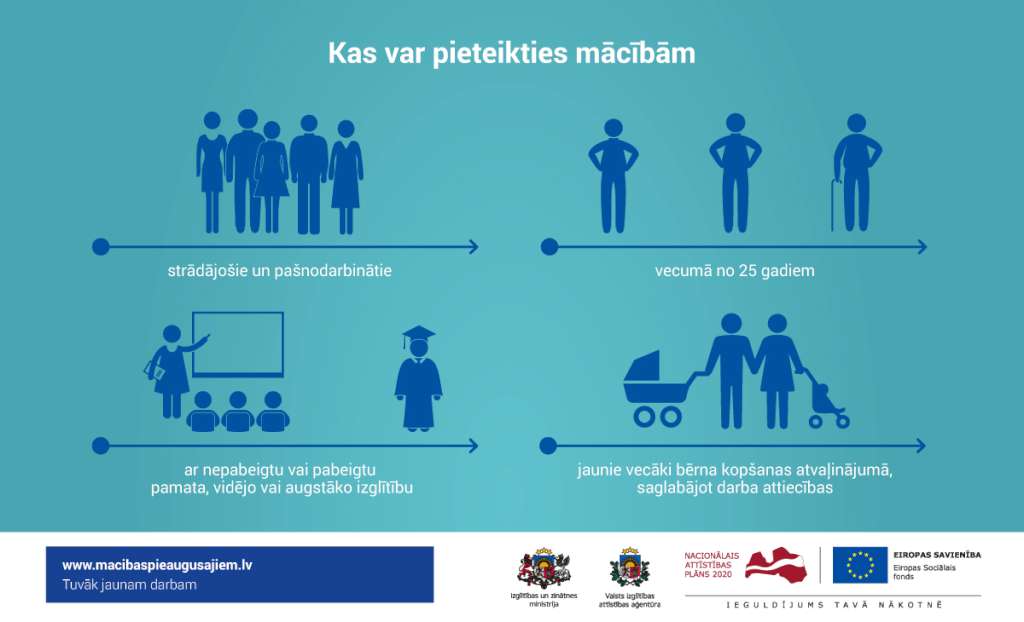 Mācībām var pieteikties strādājoši un pašnodarbināti iedzīvotāji, tai skaitā jaunie vecāki, kuri atrodas darba attiecībās un bērna kopšanas atvaļinājumā, kuri ir vecumā no 25 gadiem ar nepabeigtu vai pabeigtu izglītību, kā arī strādājoši pensionāri.