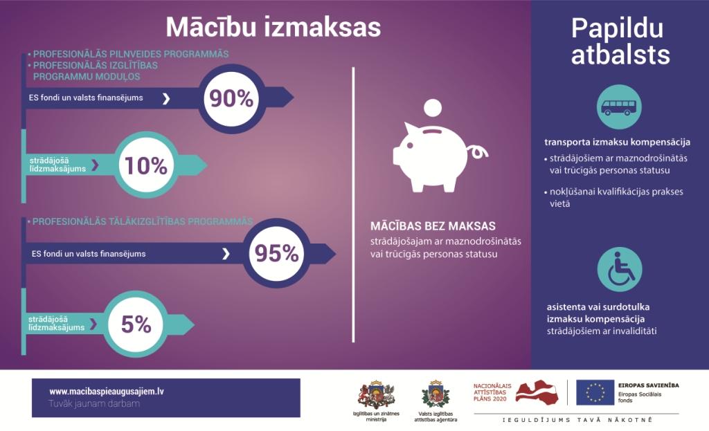 Līdzmaksājums ir tikai 10%, ko var segt arī darba devējs. Atlikušos 90% sedz ES fondi. Mācības bez maksas ir strādājošajiem ar maznodrošinātās vai trūcīgās personas statusu. Mācību maksu skatīt: šeit.